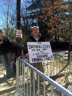 On the Upper Westside today, there was a "NOT MY PRESIDENT'S DAY rally. Mailboxes were locked down to avoid the possibility of bombs (or trash?) being put inside them. Our block was entirely barricaded as a secondary entrance and escape route to or from the rally. QNY friend Brian Griffin was there! Lots of clever signs. The crowd gathered in front of the Trump Hotel near Columbus Circle. Photos by the Baad Lamb.